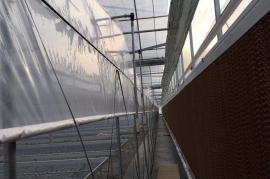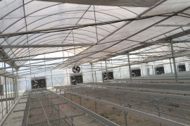 該產品由基礎、框架立柱,頂部拱管三大部分組成。點式獨立基礎,使大棚根基牢固;立柱采用熱鍍鋅方管,大大增強抗風抗雪強度;頂部由熱浸鍍鋅鋼管排列成平滑圓弧形,牢固兼美觀。同時天溝采用2mm厚熱鍍鋅板冷彎成型,容量大,排水及時;頂部天溝處和大棚四周均設置搖膜通風系統(tǒng),是大棚內部氣流通暢。此產品可根據需要實現相關配套設施,以便達到更理想的效果,如外遮陽系統(tǒng)、內遮陽保溫系統(tǒng)、降溫系統(tǒng)、加溫系統(tǒng)、噴滴灌系統(tǒng)等。