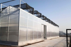 PC板溫室可做成拱形或者尖頂,該溫室的覆蓋材料為聚碳酸酯中空板(PC陽(yáng)光板),與其他覆蓋材料相比,具有采光好、保暖、請(qǐng)便、強(qiáng)度高、防結(jié)露、抗沖擊、阻燃、經(jīng)濟(jì)耐用等優(yōu)點(diǎn),該板的向陽(yáng)面具有放紫外線圖層,抗老化性能達(dá)10年。溫室使用壽命長(zhǎng),外形美觀漂亮,保溫效果好,冬季可節(jié)省加熱能耗。