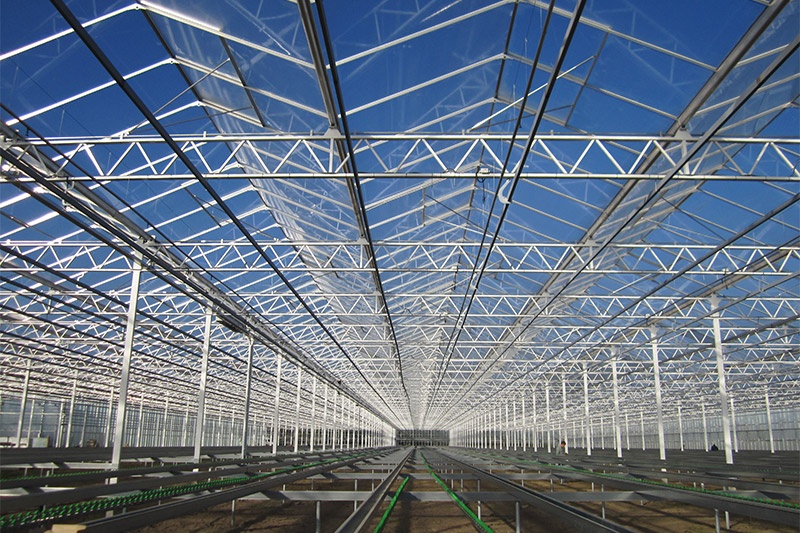 文洛式玻璃溫室為一跨三尖頂、雙坡面小屋頂桁架結(jié)構(gòu)、多雨槽、具有美觀、吊掛能力強(qiáng)、透光性好、空間大、機(jī)械性能強(qiáng)等優(yōu)點(diǎn)。