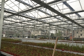 文洛式玻璃溫室為一跨三尖頂、雙坡面小屋頂桁架結(jié)構(gòu)、多雨槽、具有美觀、吊掛能力強、透光性好、空間大、機械性能強等優(yōu)點。